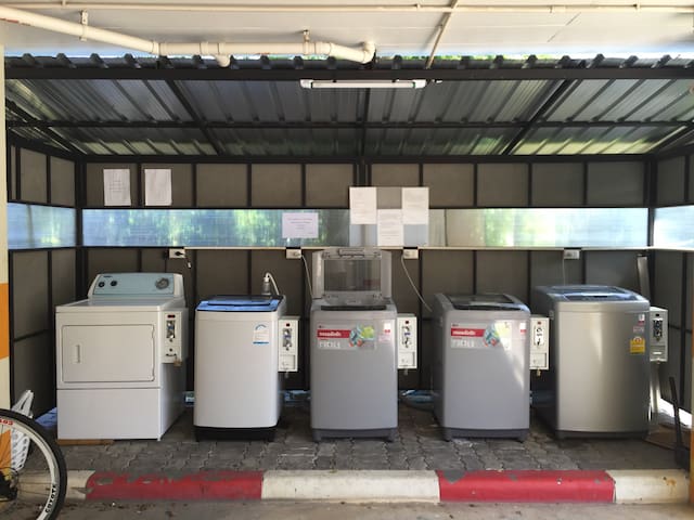 Guests have access to a small gym, and washing machines and dryers are conveniently available within the building.