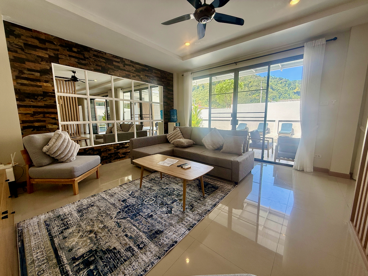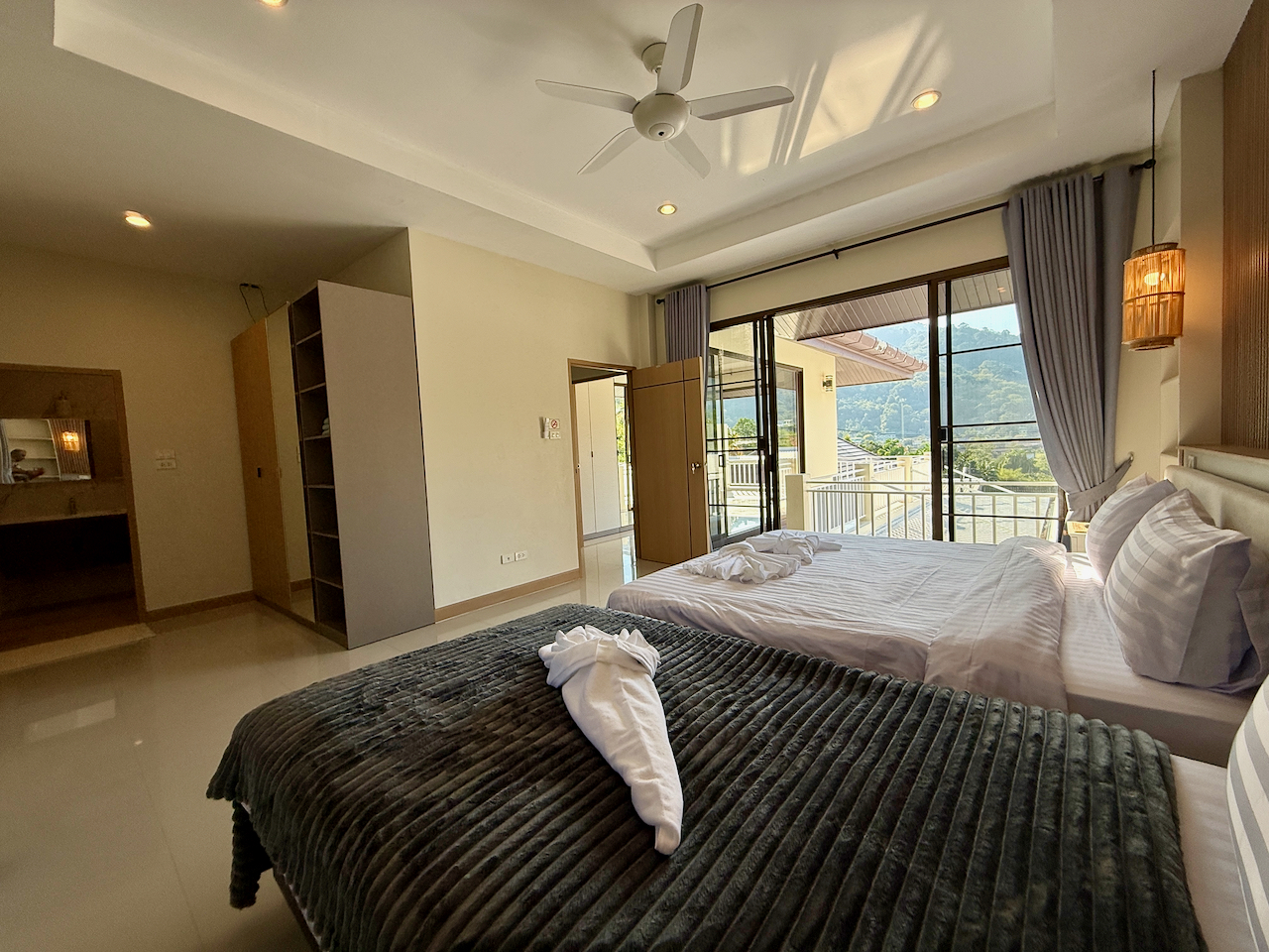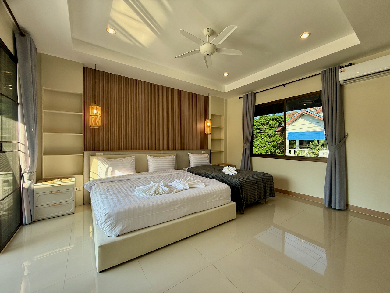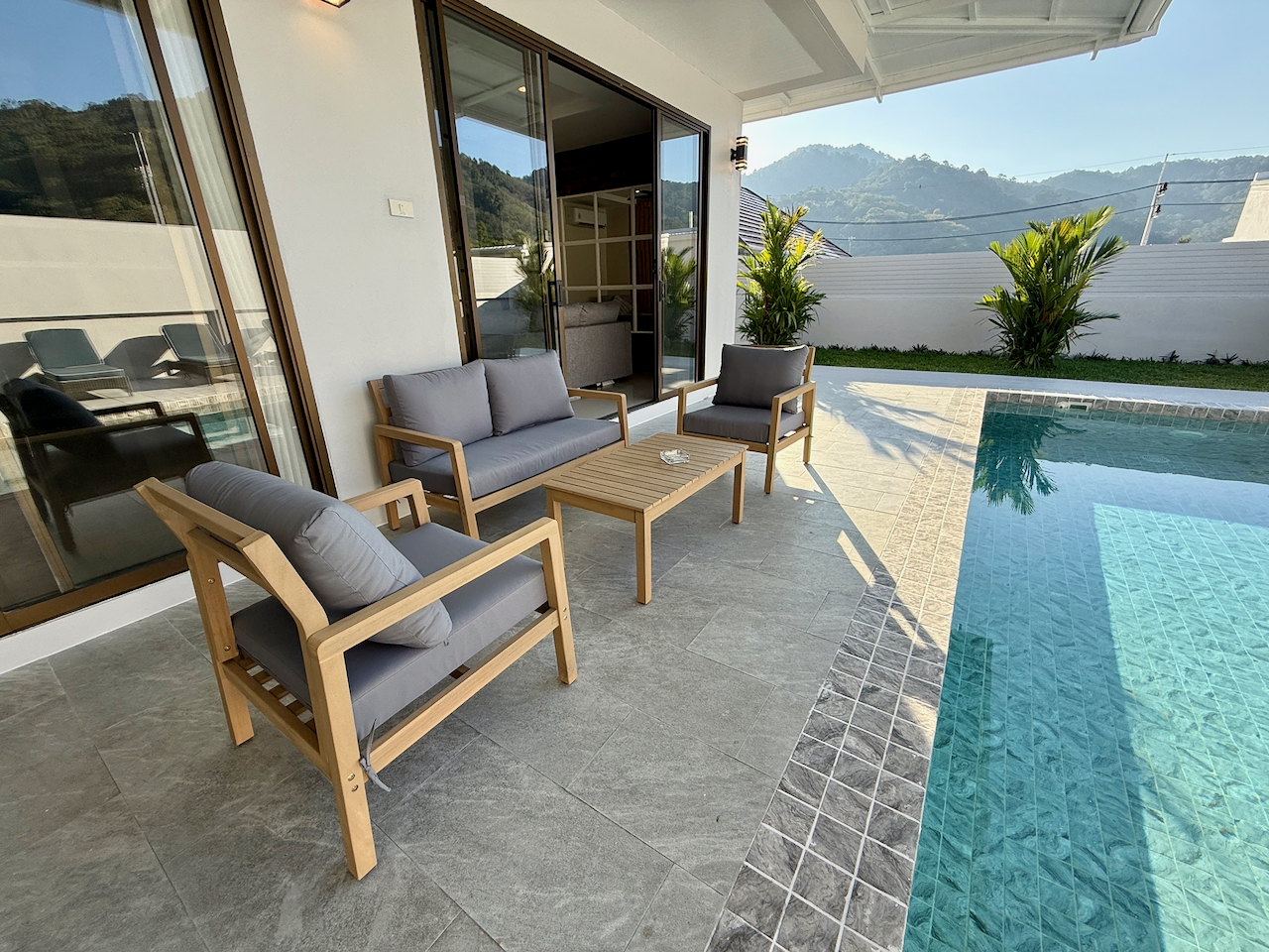 Modern 3-bedroom villa in Kathu, close to British International School (BIS) and Kajonkiet International School (KIS). Enjoy a private pool, BBQ, mountain-view terrace, and high-speed Wi-Fi. All bedrooms feature king-size beds, ensuite bathrooms, air conditioning, and ceiling fans; one room also includes a single bed. A sofa bed allows up to 9 guests. Quiet residential location between Red Mountain Golf Club and Phuket Wake Park. A car or scooter is recommended.