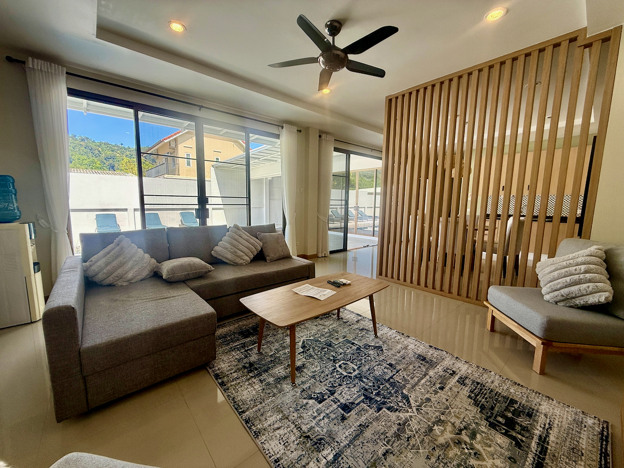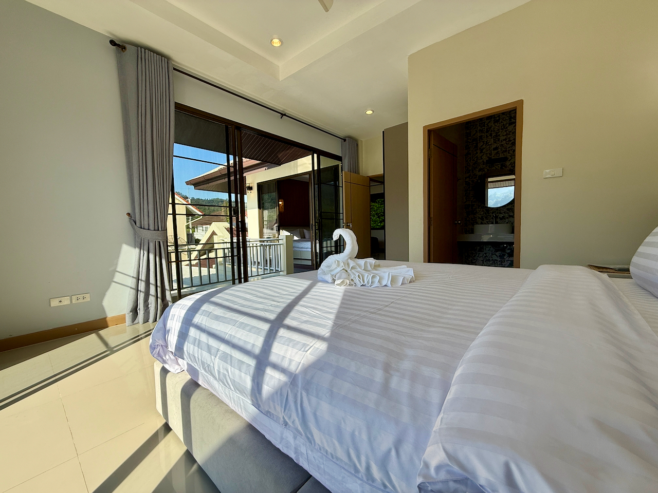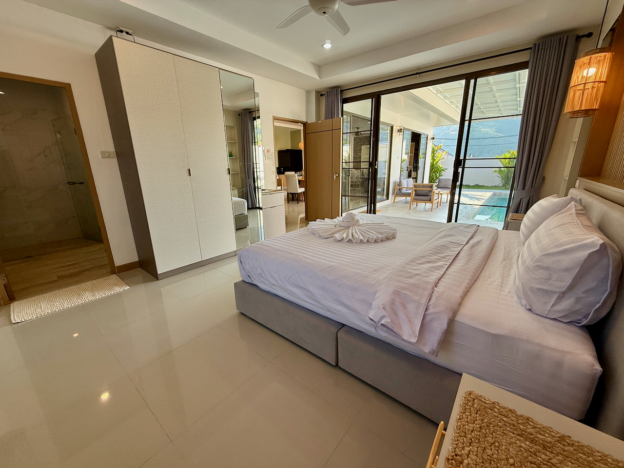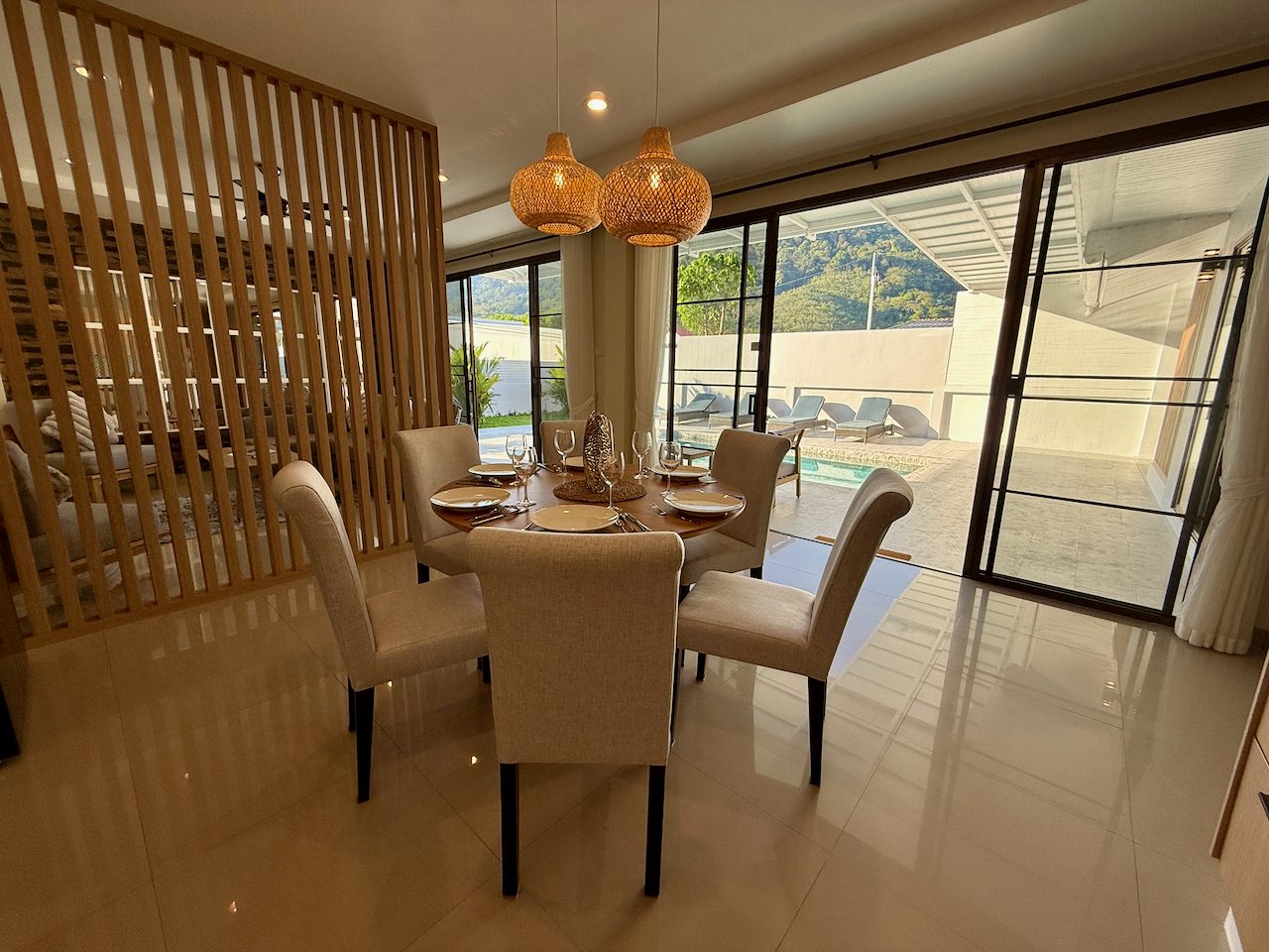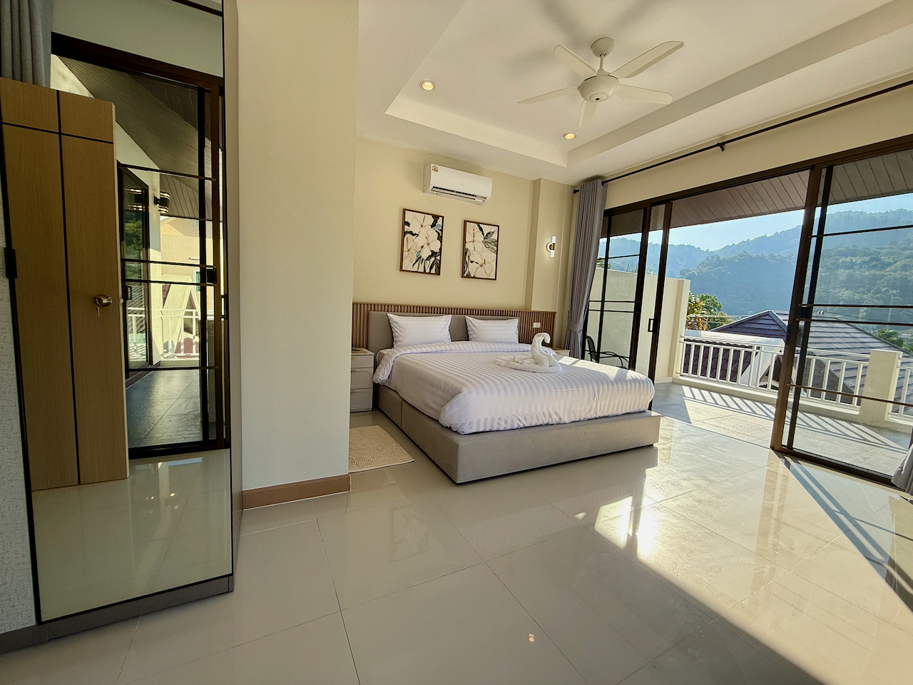 Modern 3-bedroom villa in Kathu, close to British International School (BIS) and Kajonkiet International School (KIS). Enjoy a private pool, BBQ, mountain-view terrace, and high-speed Wi-Fi. All bedrooms feature king-size beds, ensuite bathrooms, air conditioning, and ceiling fans; one room also includes a single bed. A sofa bed allows up to 9 guests. Quiet residential location between Red Mountain Golf Club and Phuket Wake Park. A car or scooter is recommended.