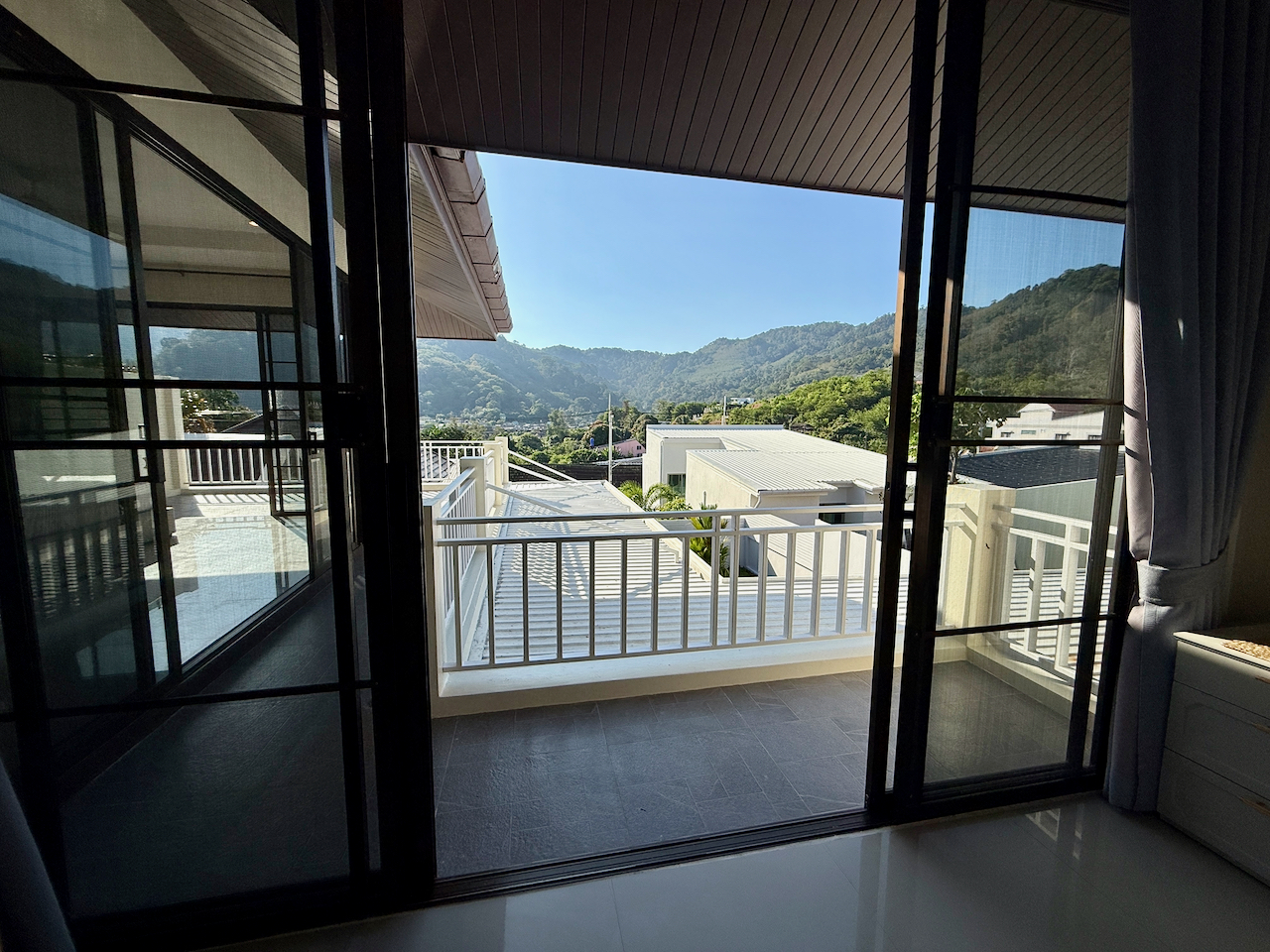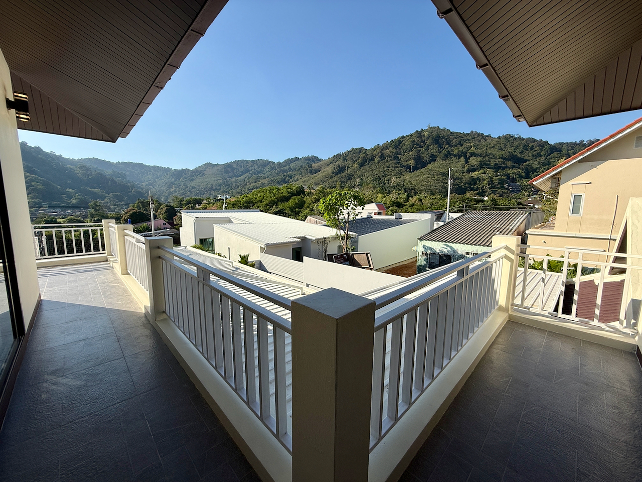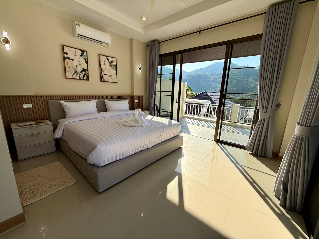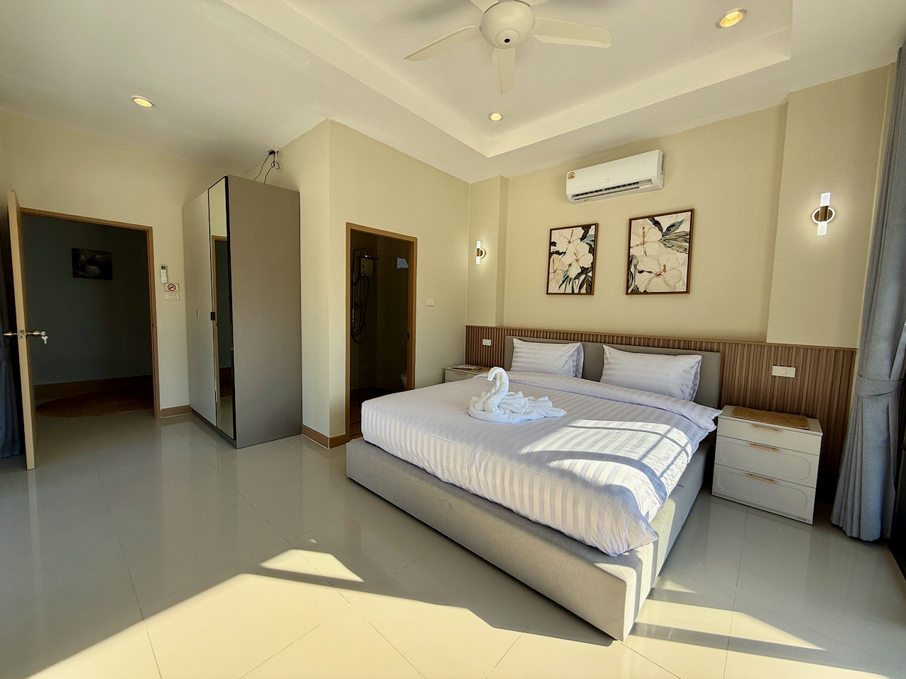 Modern 3-bedroom villa in Kathu, close to British International School (BIS) and Kajonkiet International School (KIS). Enjoy a private pool, BBQ, mountain-view terrace, and high-speed Wi-Fi. All bedrooms feature king-size beds, ensuite bathrooms, air conditioning, and ceiling fans; one room also includes a single bed. A sofa bed allows up to 9 guests. Quiet residential location between Red Mountain Golf Club and Phuket Wake Park. A car or scooter is recommended.