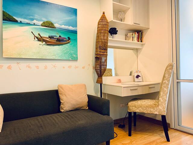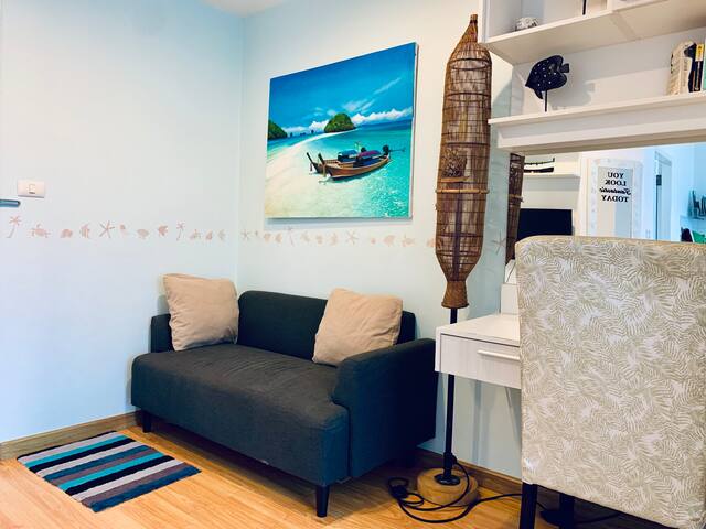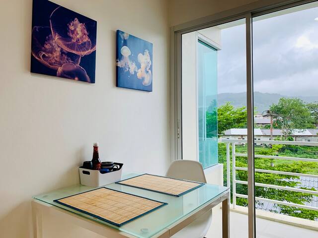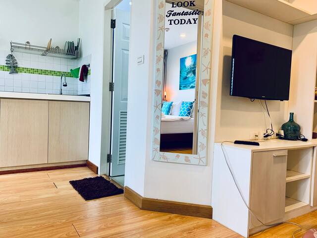 This recently renovated 30sqm condo on the 4th floor of PLUS Condominium offers a comfortable space with a separate bedroom, a cozy lounge, and a fully equipped kitchen. Amenities include a microwave, air conditioning, a TV with Google Chromecast for entertainment, and a small balcony with a beautiful mountain view and a water machine, making it a great choice for a relaxing stay.