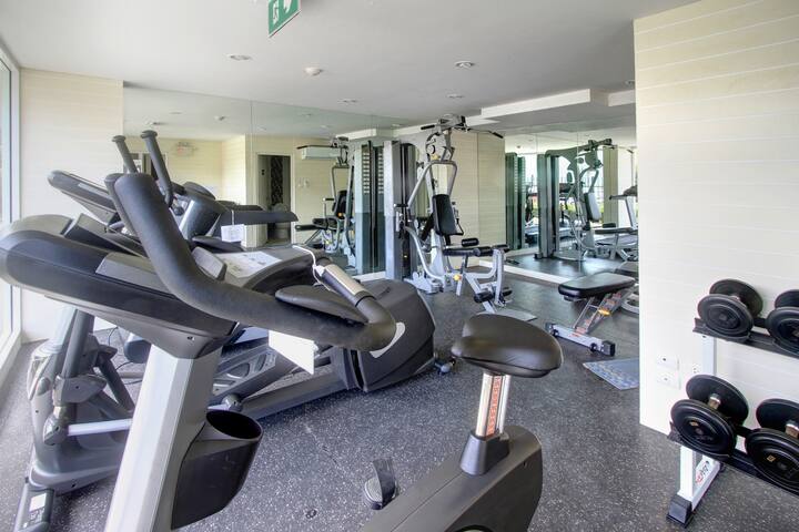 Guests have access to a small gym, and washing machines and dryers are conveniently available within the building.