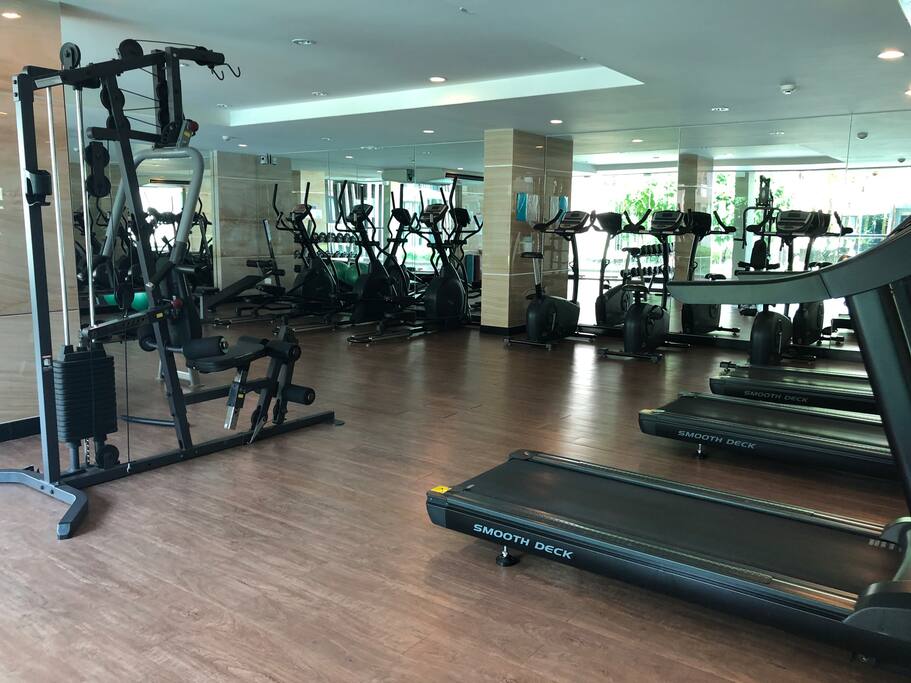 Guests have access to the common swimming pool and decks as well as a gym with a modern equipment and a sauna.