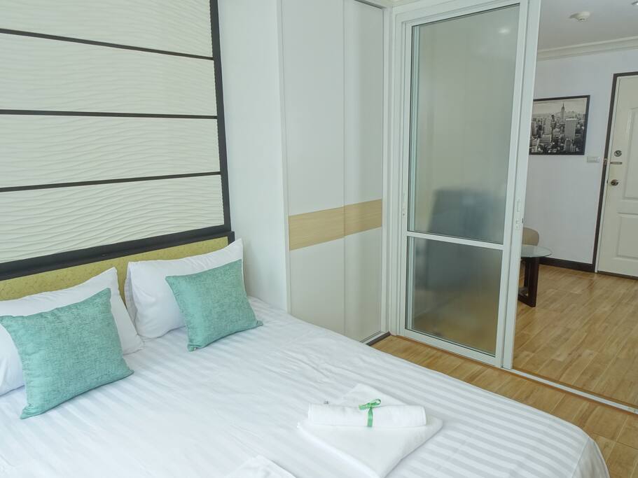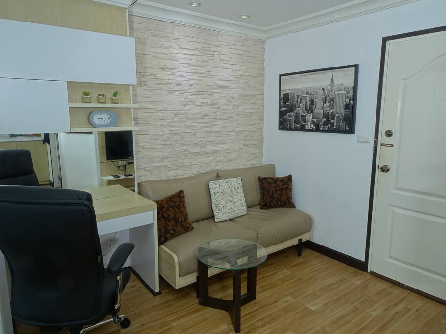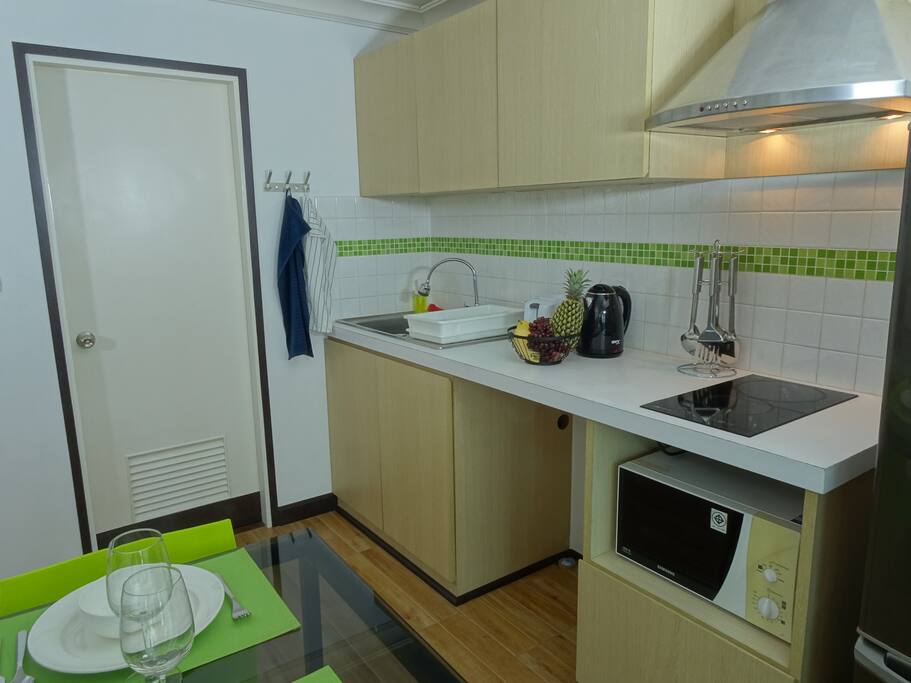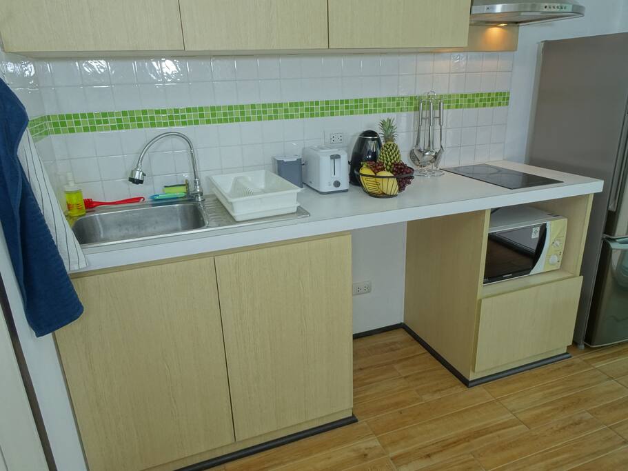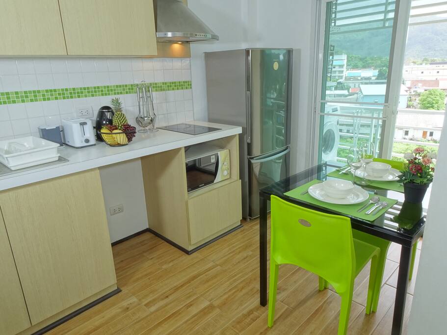 This 30sqm condo on the 7th floor features a separate bedroom, a lounge and a fully equipped kitchen. A microwave, 2 aircon units, cable TV (with Chromecast), a washing machine and a small balcony with a mountain view.