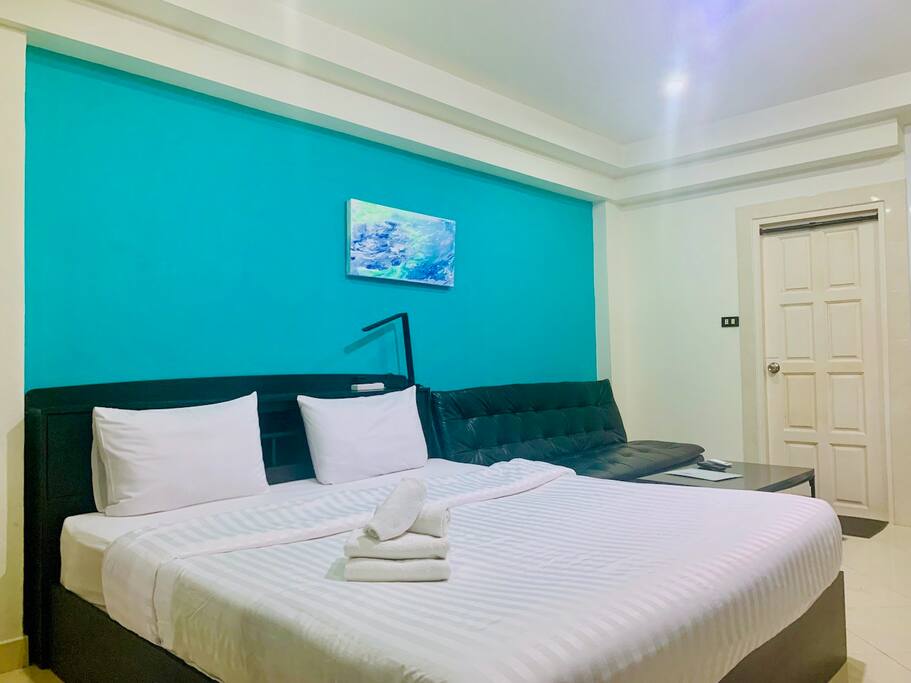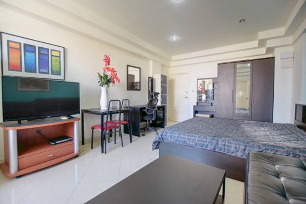 The studio features a classic design with warm white and brown tones, a king-size bed, air conditioning, smart TV, Wi-Fi, and a convenient kitchenette for light meals and snacks. While the building doesn’t include a gym or pool, you’ll find cafés, restaurants, massage shops, and nightlife just around the corner.