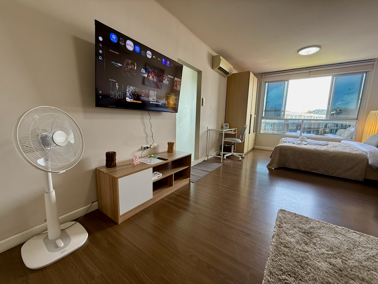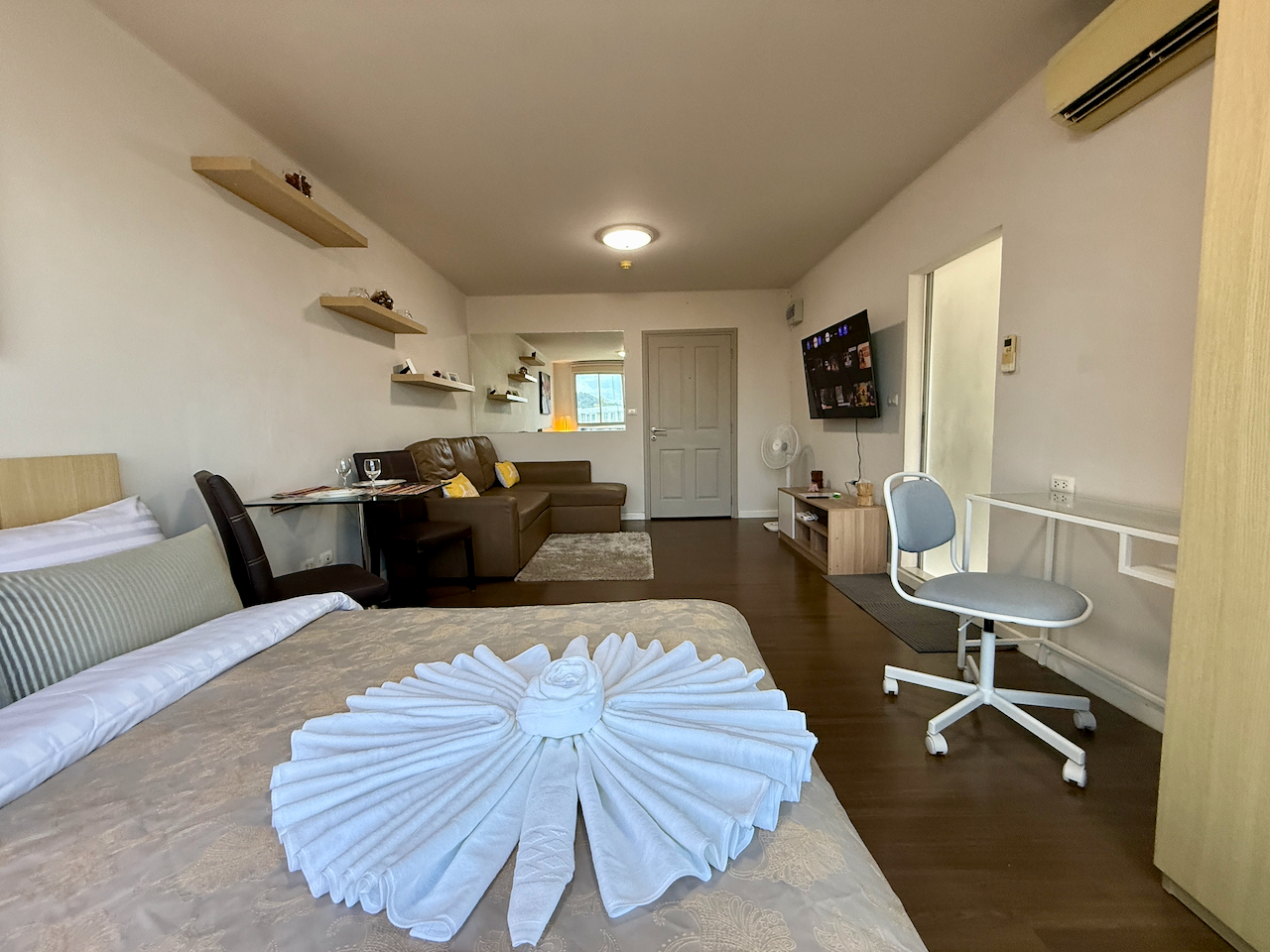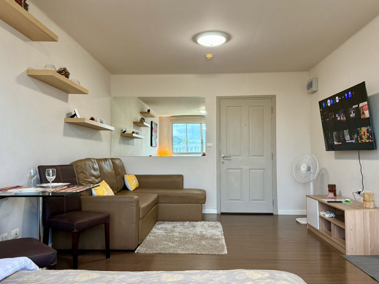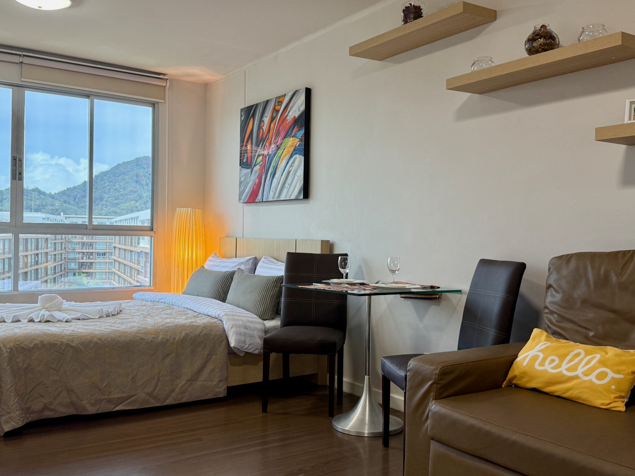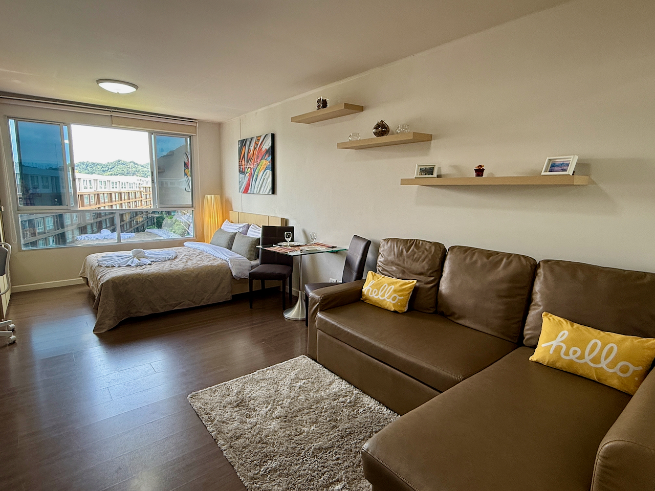 Perched on the 8th floor of DCondo Creek, this bright 30 sqm studio combines comfort and convenience with open views of the pool and gardens. It comes with a queen-size bed, a sofa bed, a fully equipped kitchen, air conditioning, a Smart TV, high-speed internet, a dedicated workspace, and a balcony with a washing machine.